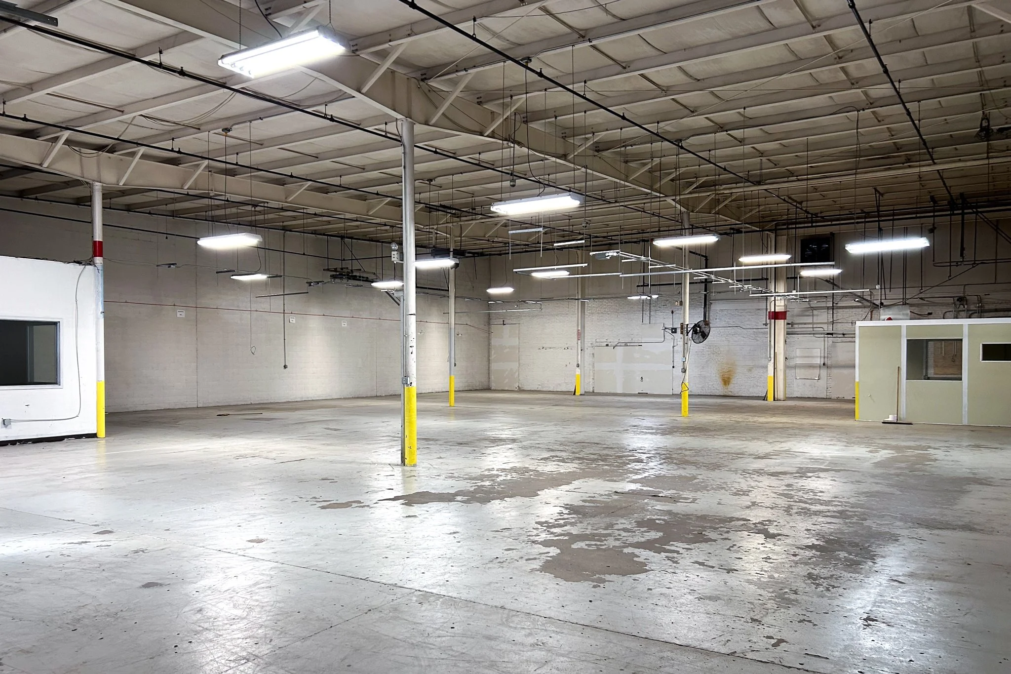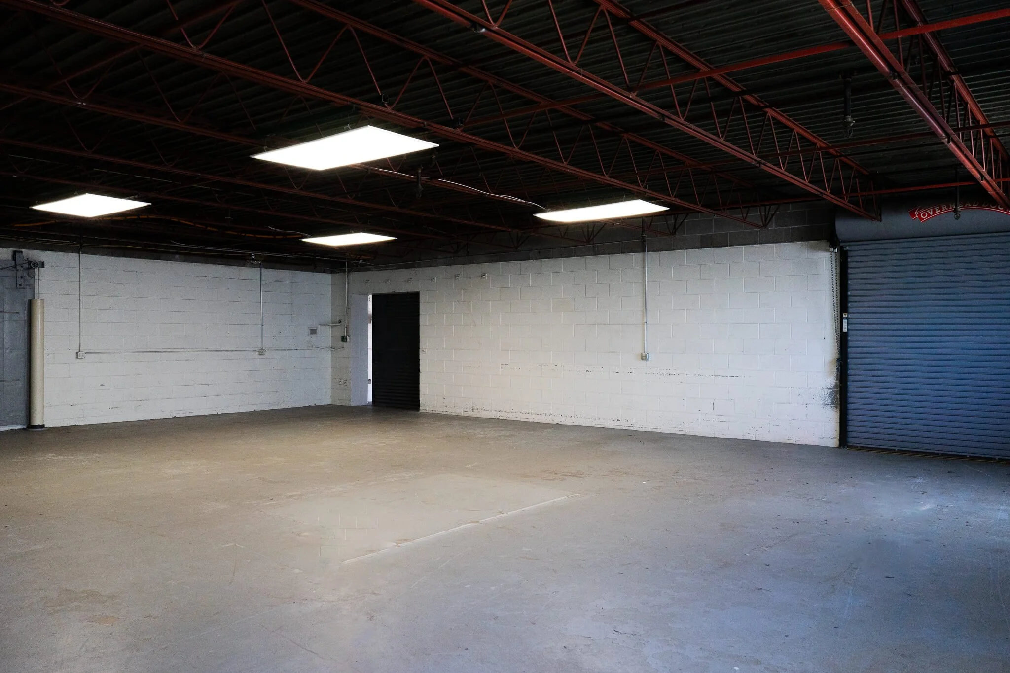 A raw, open warehouse with concrete floors, high ceilings, and loading access. Full of potential for fabrication, light manufacturing, shared workspace, or long-term creative buildout.