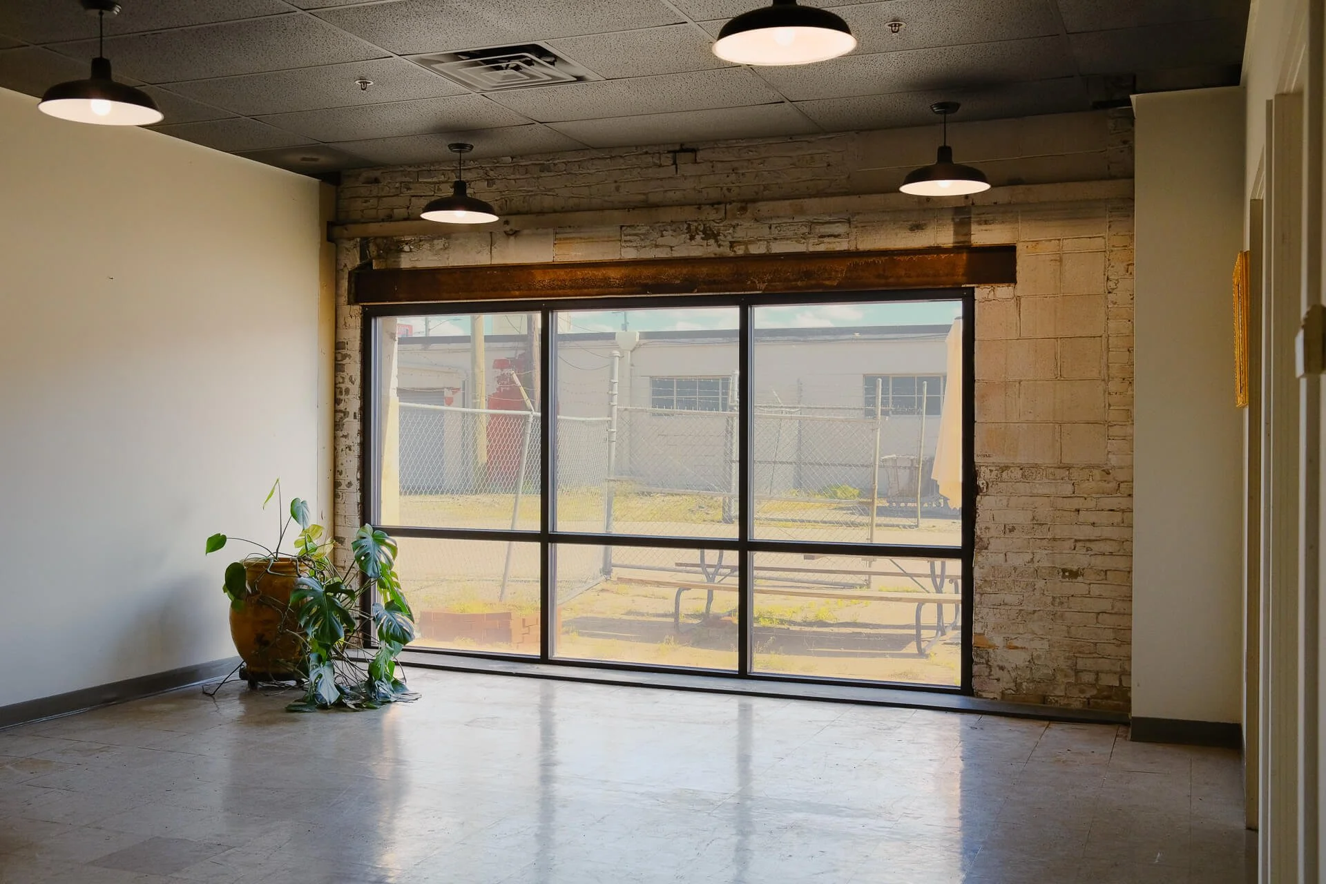 At the end of the courtyard, two rooms form the connection between our Sample and Tutt Street buildings. This space features courtyard access, brick and block walls, and a concrete floor.